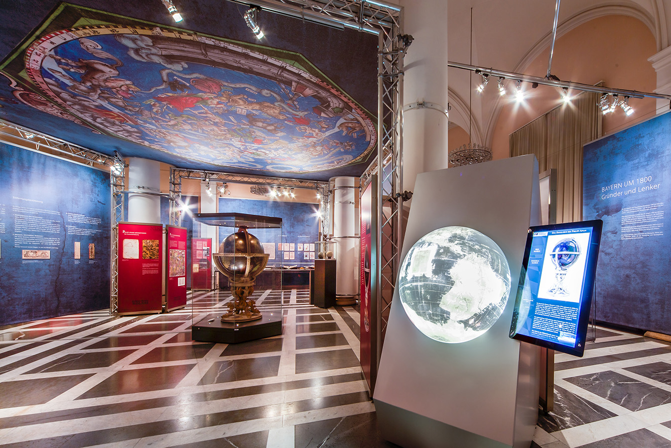 links: Ölbild mit Goldrahmen. Halbfigur Philipp Apian von 1590 in zeitgenössischem Gelehrtengewand: schwarzer Talar mit Pelzkragen und Halskrause aus weißem gestärktem Leinen. Apian hält ein Buch in der linken Hand. Schriftzug oben rechts: Philippus Apianus Medinicinae Doctores et Professor Mathem 1590. links oben: Wappen, das mit dem Bild der Großen Karte zusammenhängt. Rechts: Philipp Apians Große Karte hängend über dem Treppenhaus der Ausstellung.