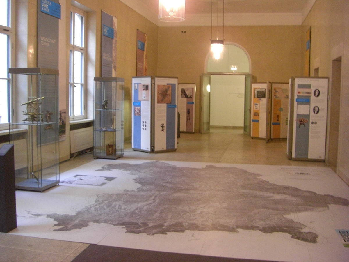Im Zentrum der Ausstellung liegt der Topographische Atlas von Bayern — präsentationswirksam als Bodenbild (ca. 8 × 5 m) für Besucherinnen und Besucher zugänglich gemacht. Großformatige Fahnen (ca. 3,50 × 1,20 m) erzählen plakativ die Entstehungsgeschichte des Atlasses und führen mit kurzen Texten in das Thema ein. Themeninseln mit Informationstafeln, historischen Instrumenten und Exponaten zeigen die technische und gesellschaftliche Entwicklung der Kartenproduktion bis in die Gegenwart.
